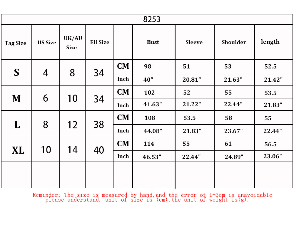 1. Asiatische Größen sind 1 bis 2 Größen kleiner als Europäer und Amerikaner. Wählen Sie die größere Größe, wenn Ihre Größe zwischen zwei Größen liegt. Bitte erlauben Sie 2-3 cm Unterschiede aufgrund der manuellen Messung. 2. Bitte überprüfen Sie die Größentabelle sorgfältig, bevor Sie den Artikel kaufen. Wenn Sie nicht wissen, wie Sie die Größe auswählen sollen, wenden Sie sich bitte an unseren Kunden
